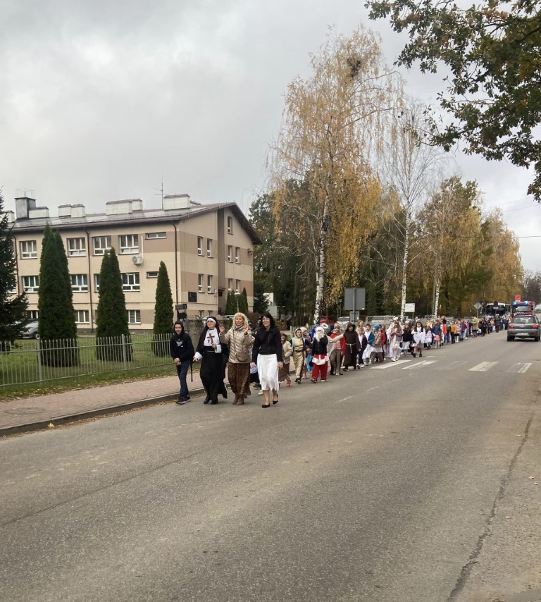 28 października 2024r. dzieci z Przedszkola i Szkoły Podstawowej im. Tadeusza Kościuszki w Miedznie miały okazję uczestniczyć w niecodziennym wydarzeniu – pierwszym Balu Wszystkich Świętych. Ta katolicka inicjatywa powstała dzięki współpracy i wsparciu miedzeńskiej parafii, miejscowej biblioteki i placówek oświatowych. Uczniowie i nauczyciele, przebrani w przepiękne kostiumy swoich świętych patronów, barwnym korowodem wyruszyli spod szkoły, rozpoczynając radosne świętowanie.