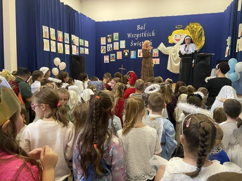 Po modlitwie radosny i rozśpiewany ,,pochód świętych”, udał się do biblioteki. Pięknie udekorowana sala balowa wypełniła się dziecięcym śmiechem. Były tańce, religijne pląsy, konkursy związane z życiem świętych, wspólne fotografie na ,,niebiańskiej ściance” oraz słodki poczęstunek. W trakcie zabawy rozstrzygnięto konkurs plastyczny ,,Mój Święty Patron”. Przepiękne prace dzieci stanowiły dekorację balu.