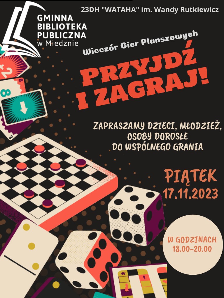 Podczas WIECZORU GIER PLANSZOWYCH będą wykonywane, a następnie upubliczniane zdjęcia zawierające wizerunek uczestników. Jeżeli nie wyrażają Państwo zgody na publikację fotografii, pomimo chęci uczestnictwa (swojego lub dziecka) w WIECZORZE GIER PLANOSZWYCH, prosimy o poinformowanie o tym pracowników Gminnej Biblioteki Publicznej w Miedznie.