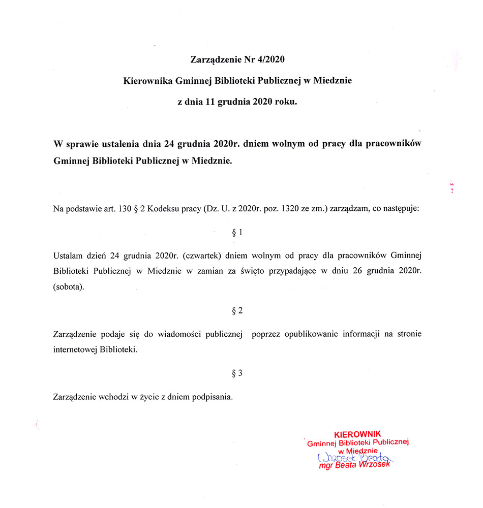 Zarządzenie Nr 4/2020 – 24 grudnia dniem wolnym od pracy 16 grudnia 2020 24 grudnia biblioteka będzie zamkniętaPobierz